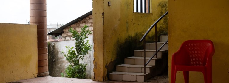 Der Haupteingang zum Gemeinschaftsraum der New Life Church. Drinnen werden Jugendliche über Safer Sex aufgeklärt. In einer Ecke wird Kleinkindern gründliches Händewaschen beigebracht. Mombasa, Kenia, November 2023.