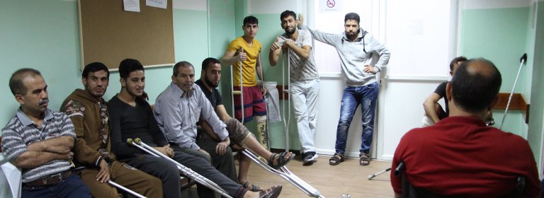 L'établissement de soins postopératoires géré par MSF à Mossoul Est. Une agent de promotion de la santé passe devant les salles d'isolement qui accueillent les patients atteints d'infections résistantes aux antibiotiques.