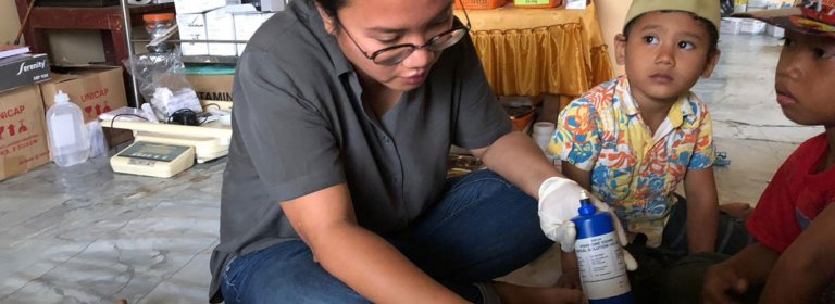 Le Dr. Rangi Wirantika en train de soigner Adam, 4 ans, blessé à la tête alors qu’il tentait de fuir le tsunami à Sulawesi, Indonésie.